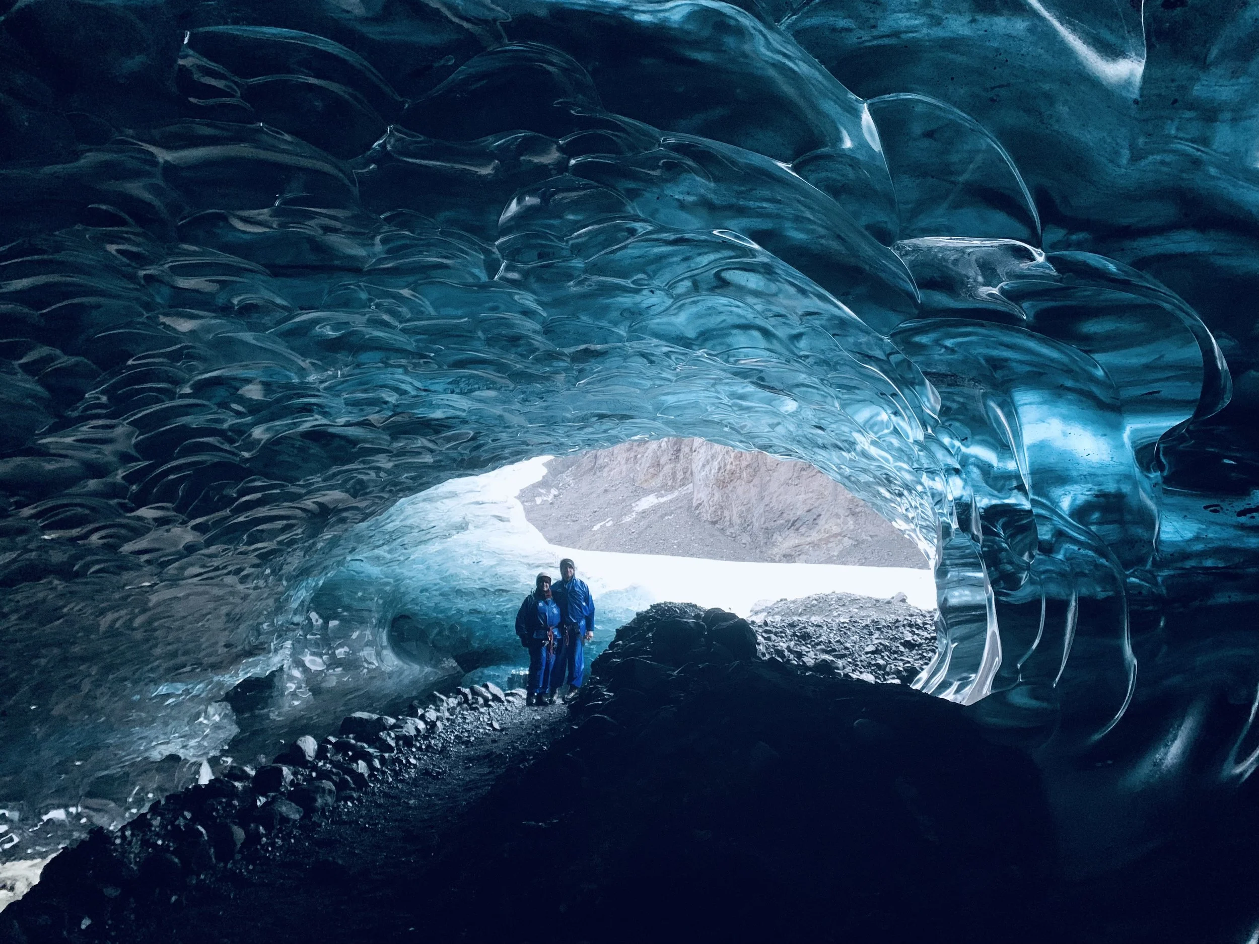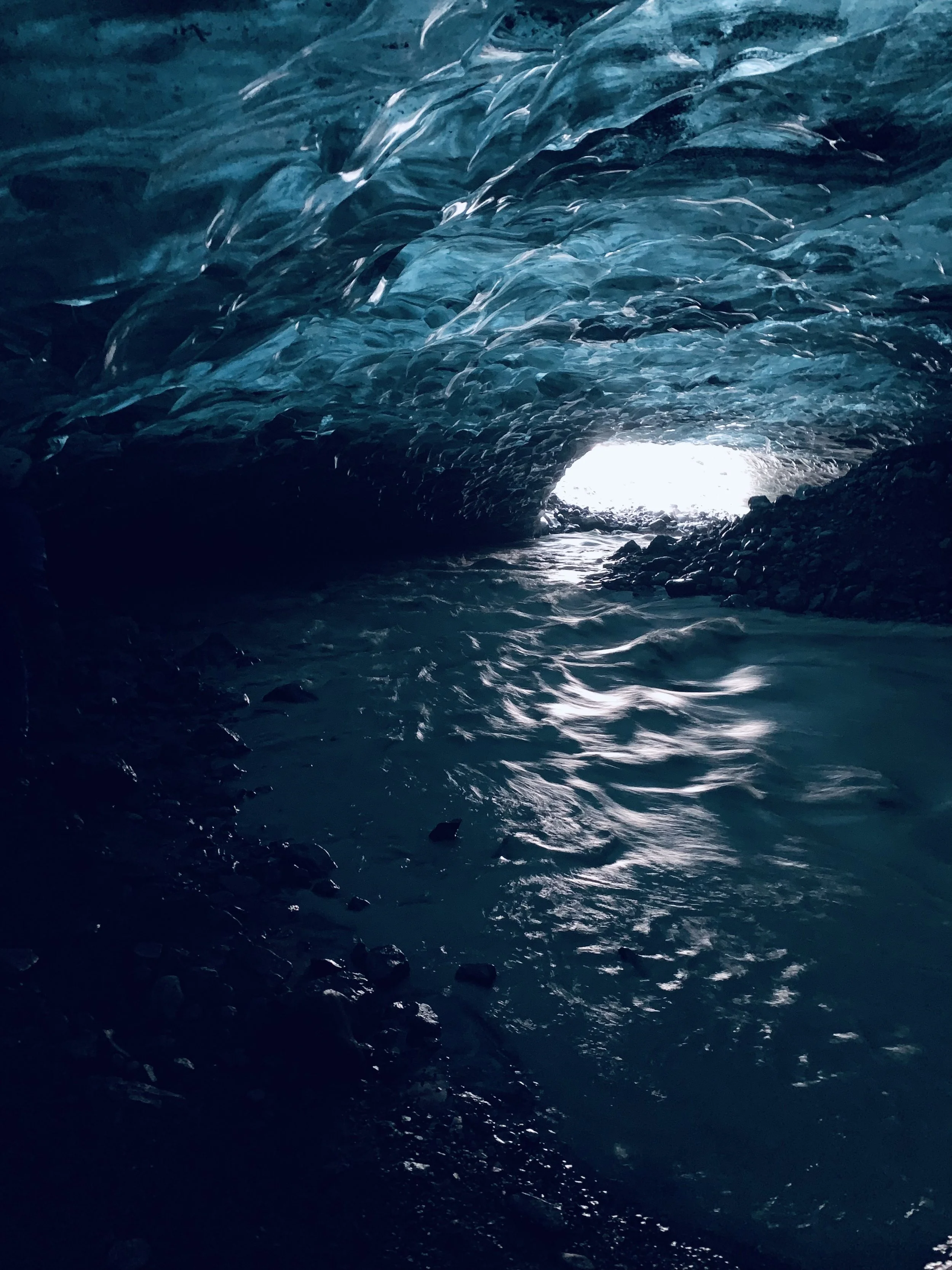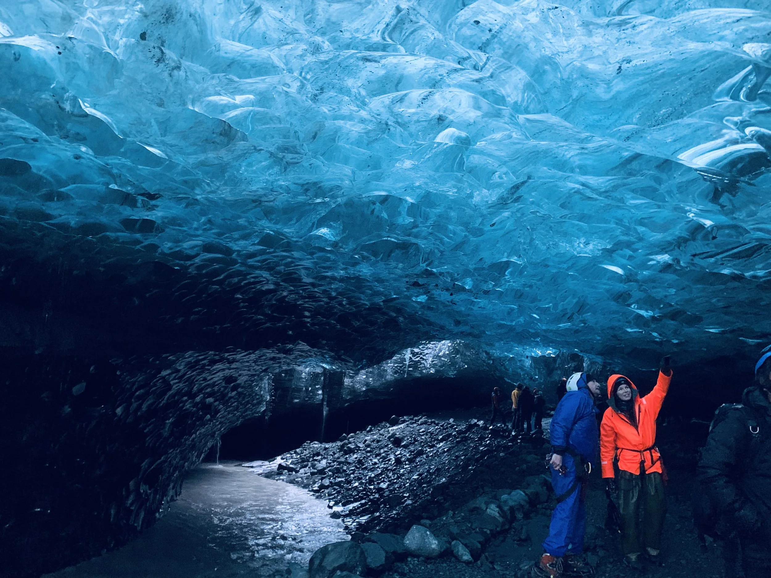 When we reached the edge of the ice again we were able to take the crampons off and enter the, by now almost empty, cave. As we stepped into this strange new magical blue world, it was like nothing I’ve ever experienced. Standing at the gigantic entrance to the Ice Cave, the texture of the ice glistens in the sun. Looking ahead, you can see endless shades of blue descend all the way to a point where all becomes darkness. The blue ice arch is spectacular, and as you look up, the ceiling above you is a mass of scalloped blue waves of ice - just stunning. The floor of the cave at its lowest point was a turbulent river of ice water rushing and tumbling down the slope, but in fact the very day before there had been no river at all, just a flat floor in the cave. The 24 hours of torrential rain that we had had leading up to our trip had changed the place completely.