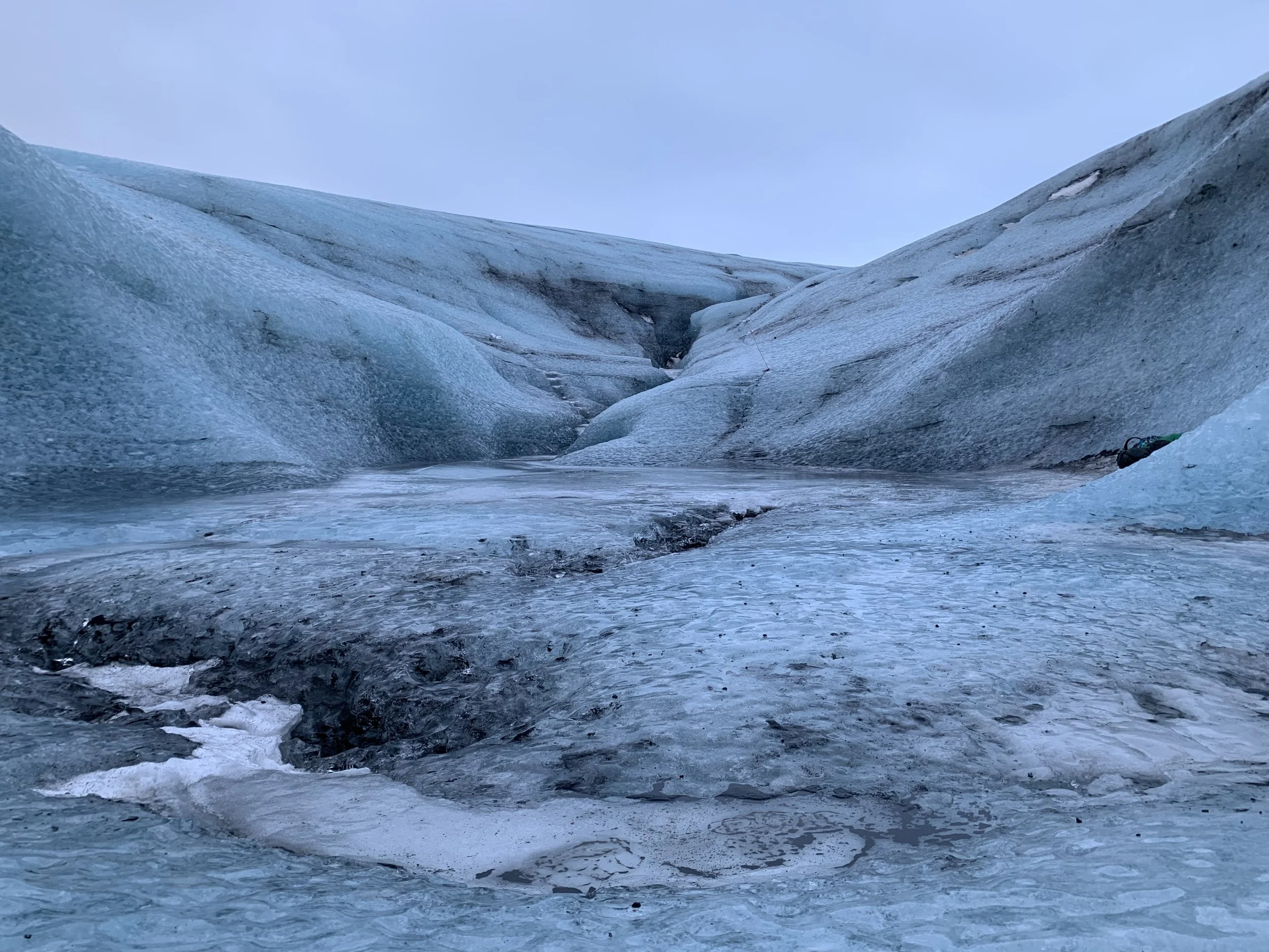 What I hadn’t been prepared for was the opportunity to actually climb down part of one of the moulins, clambering back up an almost vertical shaft of solid smooth ice. One by one, we unclipped ourselves from the safety of the ropes and went to explore the narrow route down into the ice. As we made our way down the narrow crevasse, the fast-flowing stream of water running down the bottom of it meant that we had to make our way down astride the bottom of the V with crampons digging in on the almost vertical sides of the V. Getting up the sinkhole necessitated a combination of digging in the tips of our crampons and pushing upwards, at times scrabbling and slithering upwards, to the next tiny ledge. Given how slippery it was, and how cramped and confined the vertical tunnel, it was so far outside my comfort zone as to challenge me physically and mentally, possibly more than anything else I have ever done in my life. It was only the fact that I knew there were 5 people behind me that kept me going at times. I have to admit, this is one of the most frightening things I have ever done. I am just glad that I hadn’t known beforehand that we were going to do that, as I would have been a nervous wreck by the time we got there. I’m not sure whether I was more scared of becoming stuck in this narrow ice chute - triggering claustrophobia that I didn’t know I had - or slipping and hurtling back down the ice chute to the bottom of the crevasse!! However, outweighing both those fears was the fear of being the one member of the group who couldn’t do it and having to go ignominiously back the way I came, so somehow with help and encouragement from Matthew and a hand-up at the end from one of my fellow team-members I got to the top. I probably won’t ever do it again, but by golly I’m proud that I did it!!!